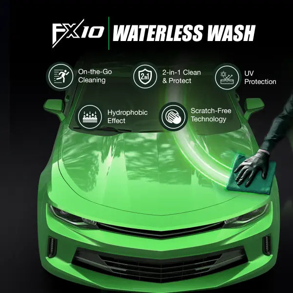 FX10 Waterless Wash is your solution for fast, effective car cleaning without a single drop of water. Perfect for On-the-Go Cleaning, this advanced formula is designed to remove light dirt, dust, fingerprints, and fresh bird droppings in minutes, making it ideal for urban living, travel, or quick touch-ups. It provides a powerful 2-in-1 Clean & Protect action: its Scratch-Free Technology uses advanced lubricants to safely encapsulate and lift dirt, while simultaneously depositing a rich wax-polish layer for a deep, High Gloss, Streak-Free Finish and lasting protection.